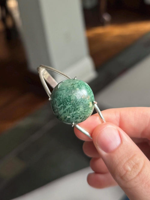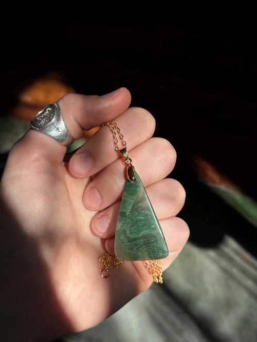 This handmade jade ring is one of a kind. Hand carved from 100% natural African green jade, this piece is uniquely yours. This ring is incredibly textured and transparent, and shines differently in every light. This stone is set in a gold filled band, size 8.
